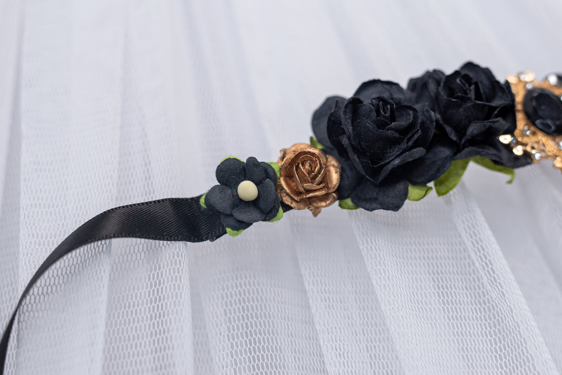 - Materials: Premium mulberry paper flowers, crystal rhinestones, satin ribbon