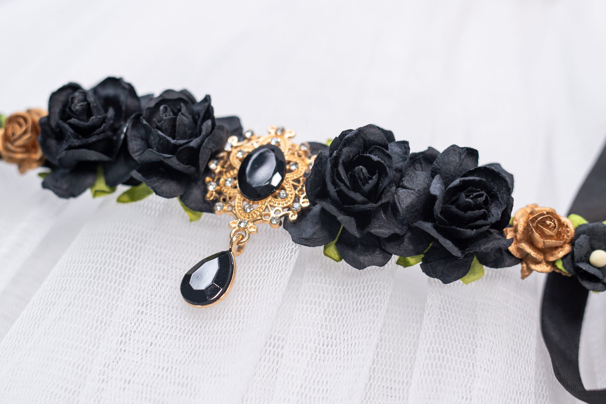 - Sparkling gold rhinestone centrepiece with black stone and teardrop pendant