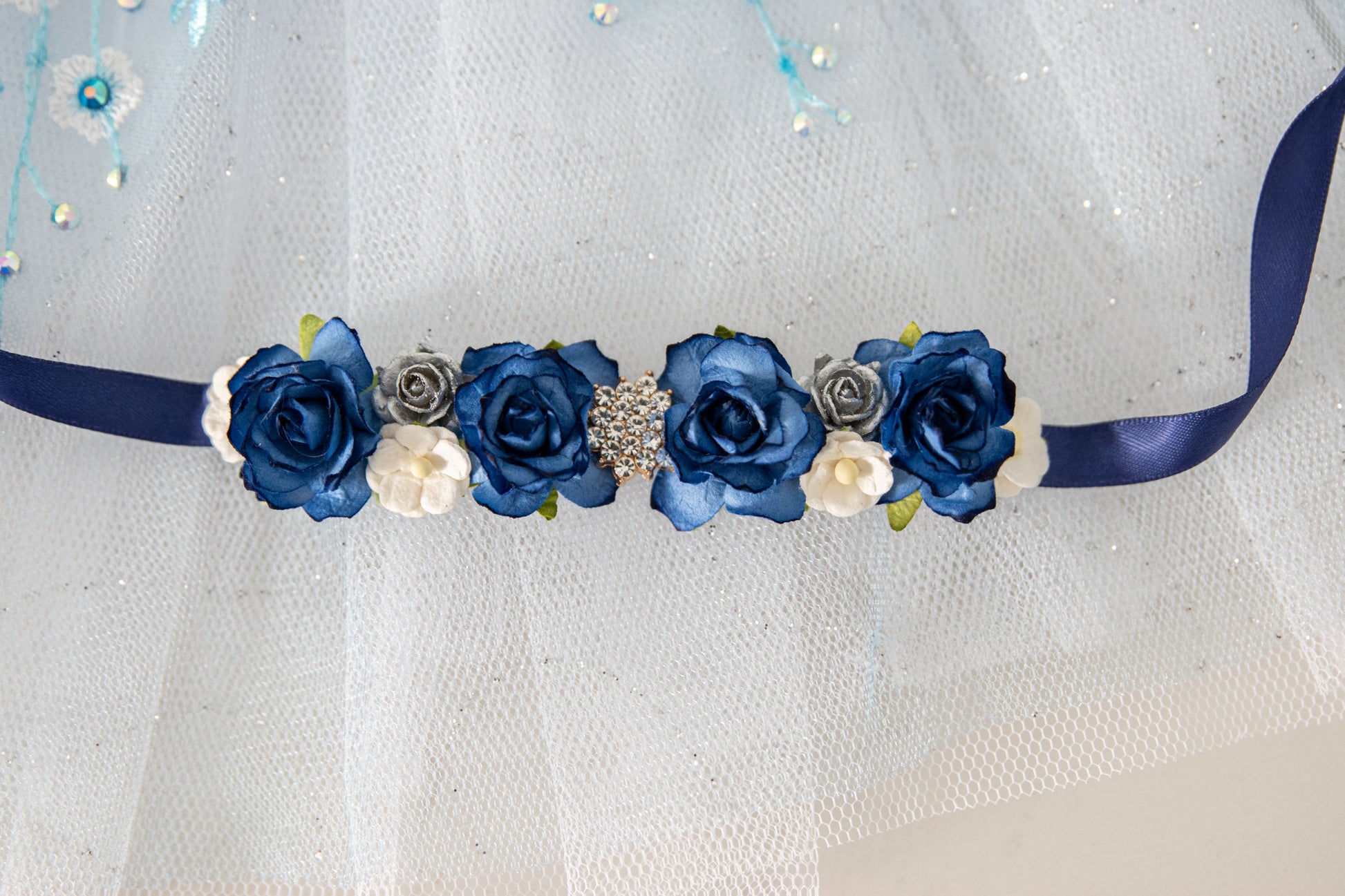 - Rich navy blue satin ribbon ties for secure, elegant attachment