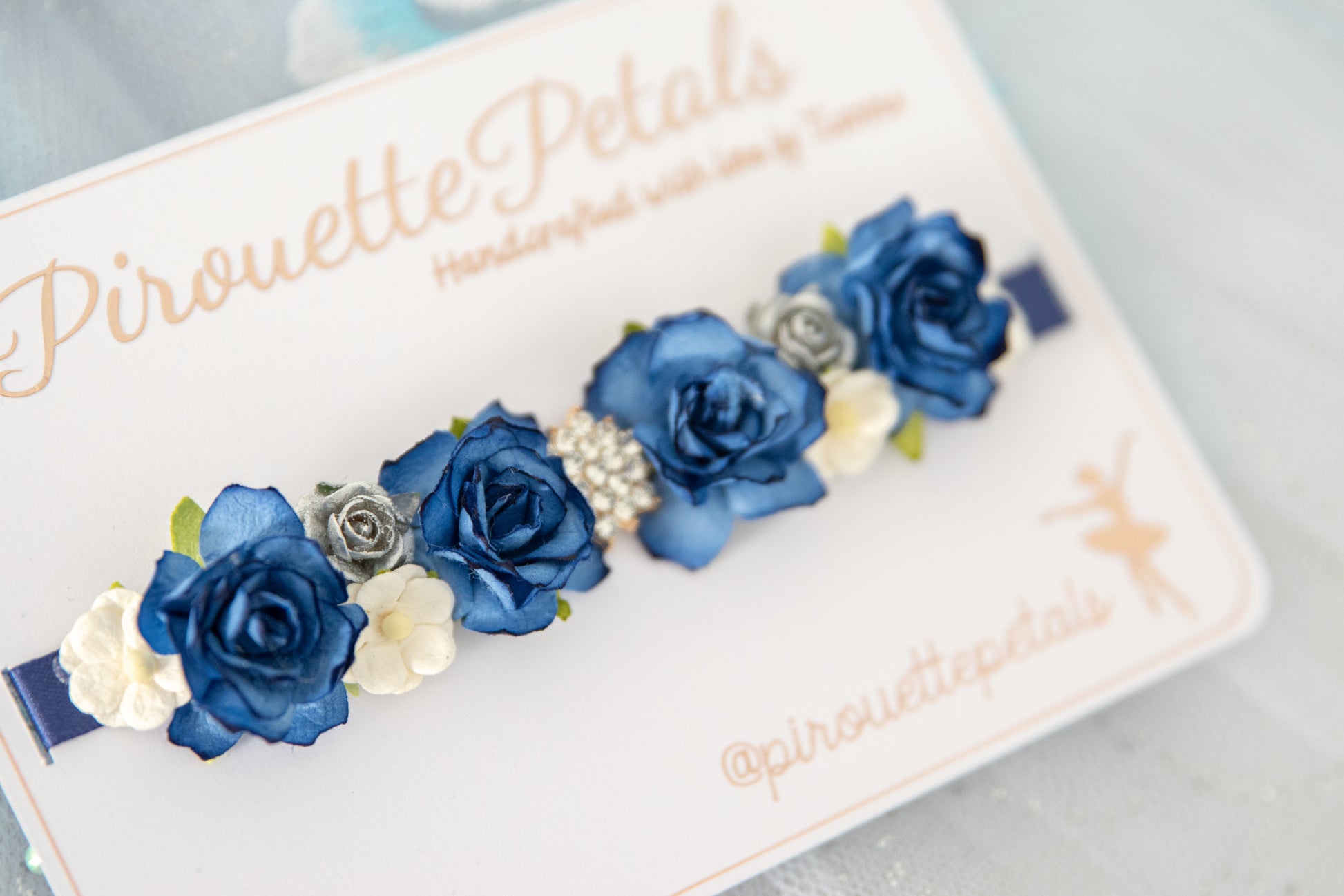 Elegant yet versatile, The Sapphire Waltz bun wrap is perfect for everything from daily dance classes to special performances. Handcrafted with rich sapphire blue roses, soft ivory accents, and a delicate crystal embellishment, it adds a polished finishing touch to any bun.